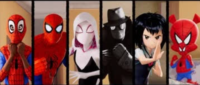 左側から、主人公スパイダーマン、元祖スパイダーマン、スパイダーグウェン、なんか黒くて怪しい感じのスパイダーマン、二次元の世界のスパイダーウーマン、そしてブタ、、、、????